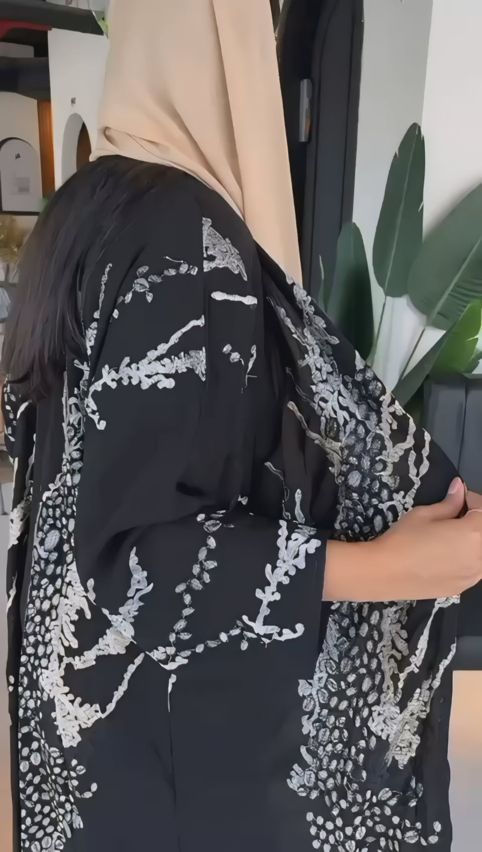 عباية سوداء بتصميم أنيق وهادئ، مصنوعة من قماش شيفون خفيف يعطي راحة في اللبس ومظهر راقٍ.